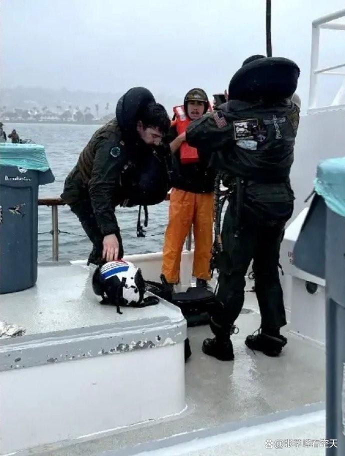 (被捞上船的飞行员,这么冷的天,估计也冻得够呛)